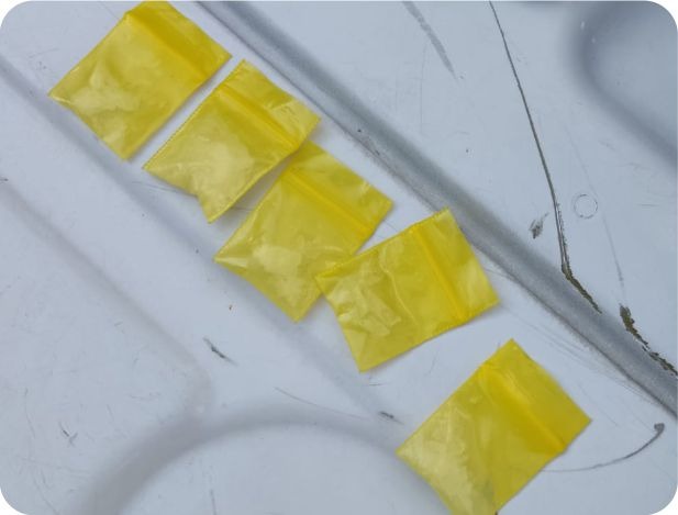 Ante la conducta evasiva por parte de la persona, el personal de la SSC procedió a interceptar a la persona para indagar la situación y mediante una inspección preventiva encontraron entre sus pertenencias cinco envoltorios pequeños de plástico con un contenido sólido granulado, siendo de características propias de la metanfetamina, conocida como cristal.