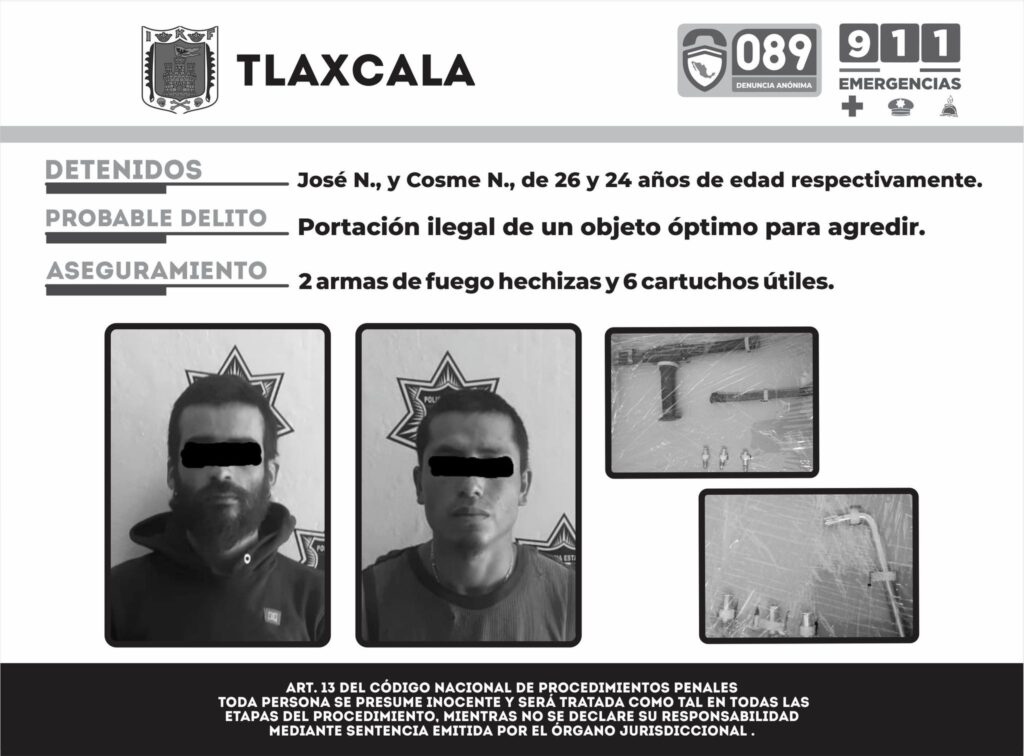Como resultado de las acciones permanentes para la prevención y combate de la incidencia delictiva en el estado de Tlaxcala, la Secretaría de Seguridad Ciudadana (SSC) detuvo el día martes en el municipio de San Cosme Xaloztoc a dos personas que portaban armas de fuego de fabricación artesanal.