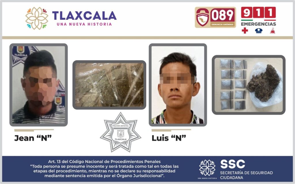 Asimismo, en calle Artículo 123 de la colonia Santa Rosa del municipio de Apizaco fue detenido Jean Carlo “N” de 23 años; luego de que elementos de seguridad estatal detectaran que portaba cinco bolsas pequeñas con marihuana.