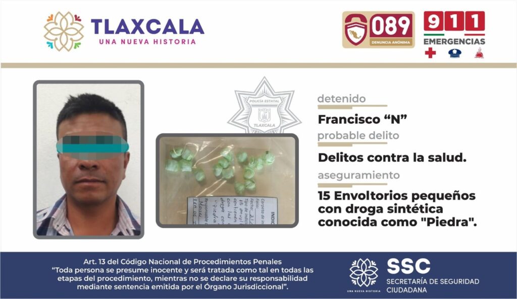 Es así que, los elementos de la SSC procedieron a la detención de quién se identificó como Francisco N., de 35 años de edad; ya que se trata de un hecho constitutivo de delito en su modalidad de narcomenudeo.