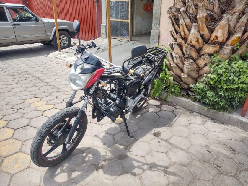 Una motocicleta Italika tipo Forza 180, la cual fue encontrada por personal de Dirección de Seguridad Delegación Muñoz de Domingo Arenas abandonada con huellas de desvalijamiento, por lo que, al realizar una inspección se percataron que cuenta con reporte de robo.