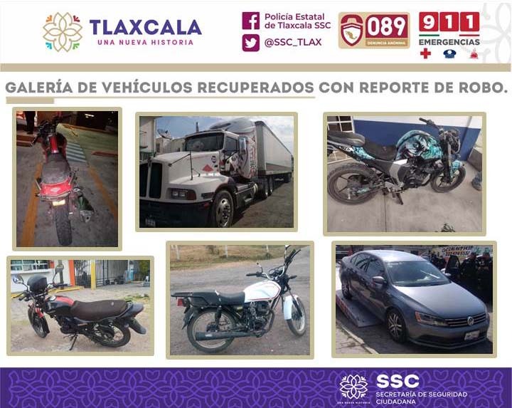 Las accione tuvieron lugar en los municipios de Tepeyanco, Huamantla, Nanacamilpa, Papalotla, Nativitas y El Carmen Tequexquitla, donde elementos de la SSC recuperaron las siguientes unidades vehiculares; en acciones distintas, 4 motocicletas, la primera de la marca Veloci, una Vento modelo 150cc, una Italika FT150 y una Yamaha 150cc, además se aseguró un tratocamión Kenworth modelo T3, y un Volkswagen modelo Jetta.