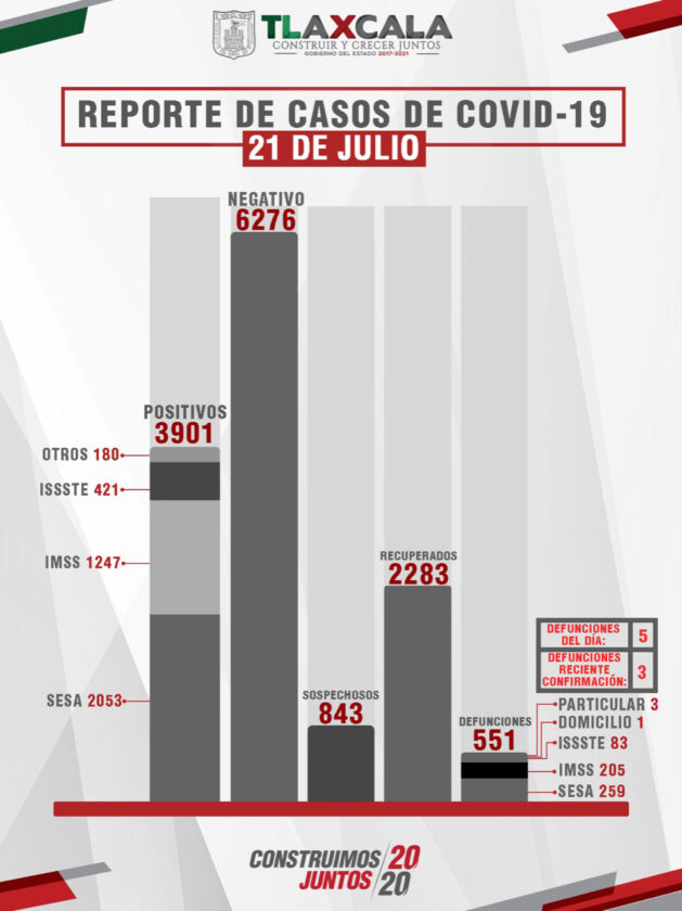 Como parte de la información que presentó la dependencia se dio a conocer que, en el reporte de este miércoles, la SESA confirmó 63 personas recuperadas, 85 casos positivos más y 5 fallecimientos de Covid-19 en Tlaxcala, de los cuales cuatro se registraron en la SESA y una en el Issste; además, en el acumulado de lamentables fallecimientos se suman tres que se registraron en el IMSS.