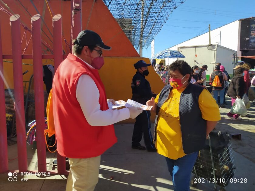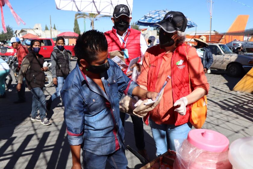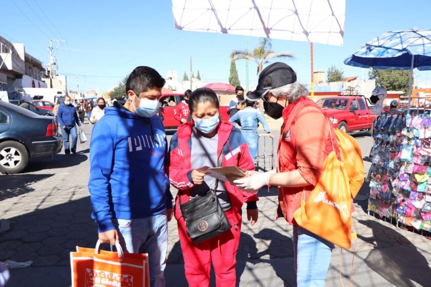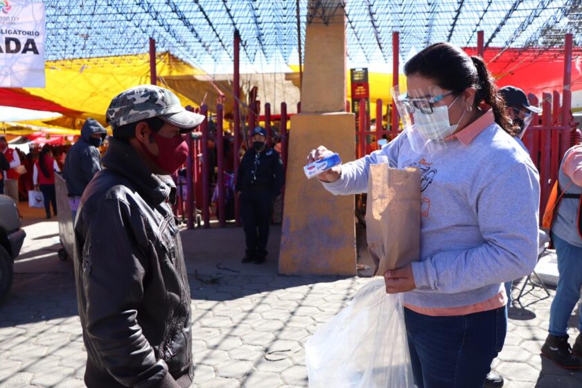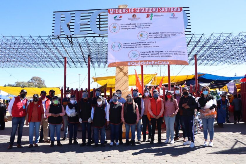 Huamantla, Tlax.- Con el objetivo de dotar a tianguistas de los días miércoles y asistentes de un kit de protección sanitaria, fue que personal del Ayuntamiento de Huamantla que encabeza Jorge Sánchez Jasso en coordinación con el Sistema DIF Municipal que preside su esposa Gabriela Escamilla Pérez y empleados de la empresa Productos alimenticios La Morena, conformaron brigadas sanitarias para recorrer los pasillos del tianguis y entregar gel antibacterial, jabón de baño, cubre bocas y un tríptico informativo a las personas.