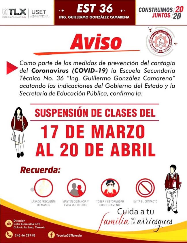 Como parte de las medidas de prevención en el contagio del “Coronavirus” (COVID-19), la Escuela Secundaria Técnica 36 “Ingeniero Guillermo González Camarena” de la capital tlaxcalteca en la colonia La Joya.
