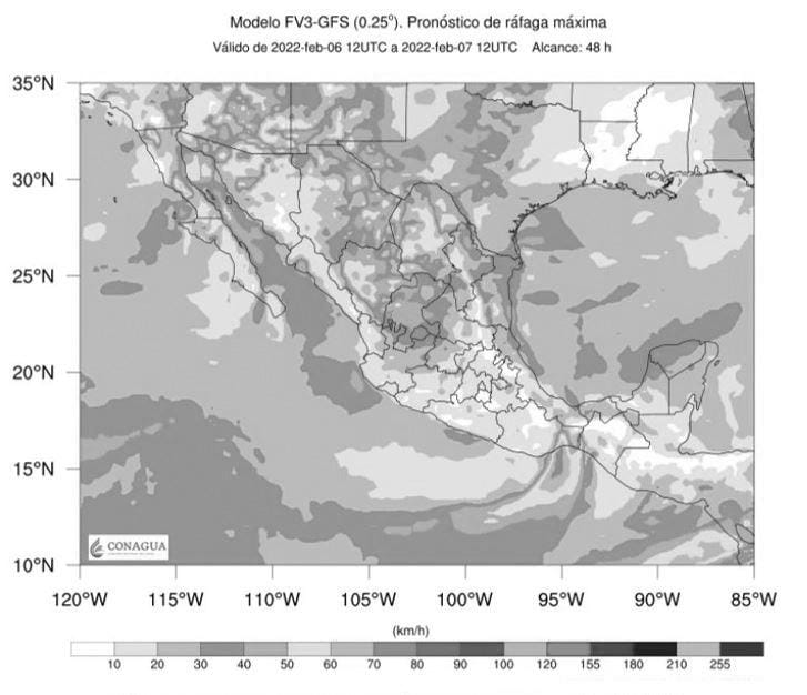 La masa de aire frío que impulsa al sistema, además de una vaguada polar sobre el noroeste del territorio nacional, en interacción con el ingreso de humedad generada por la corriente en chorro subtropical, por la tarde se pronostica, cielo medio nublado y viento de dirección variable de 10 a 20 km/h con rachas de 35 km/h.
