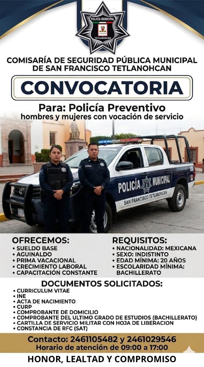 San Francisco Tetlanohcan, Tlaxcala.— Con el objetivo de fortalecer la seguridad y continuar brindando un servicio cercano a la ciudadanía, la Comisaría de Seguridad Pública Municipal de San Francisco Tetlanohcan lanzó la convocatoria para integrar a nuevos elementos a la Policía Preventiva.