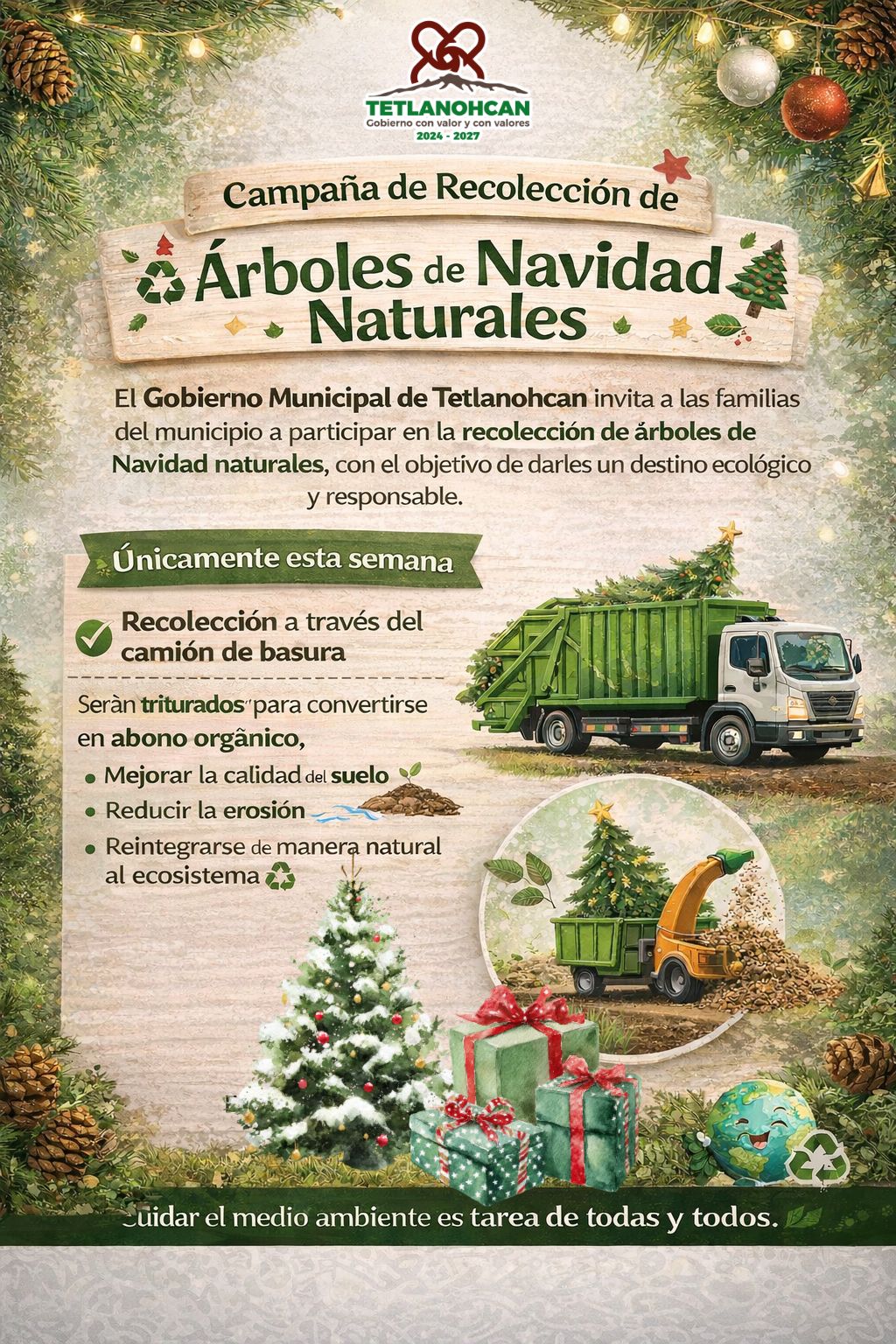 El Gobierno Municipal de Tetlanohcan, que encabeza Kritsbey Pérez Flores, puso en marcha la campaña de recolección de árboles de Navidad naturales, la cual se llevará a cabo del lunes 19 al viernes 23 de enero, con el objetivo de dar un destino ecológico y responsable a estos árboles una vez concluida la temporada decembrina.