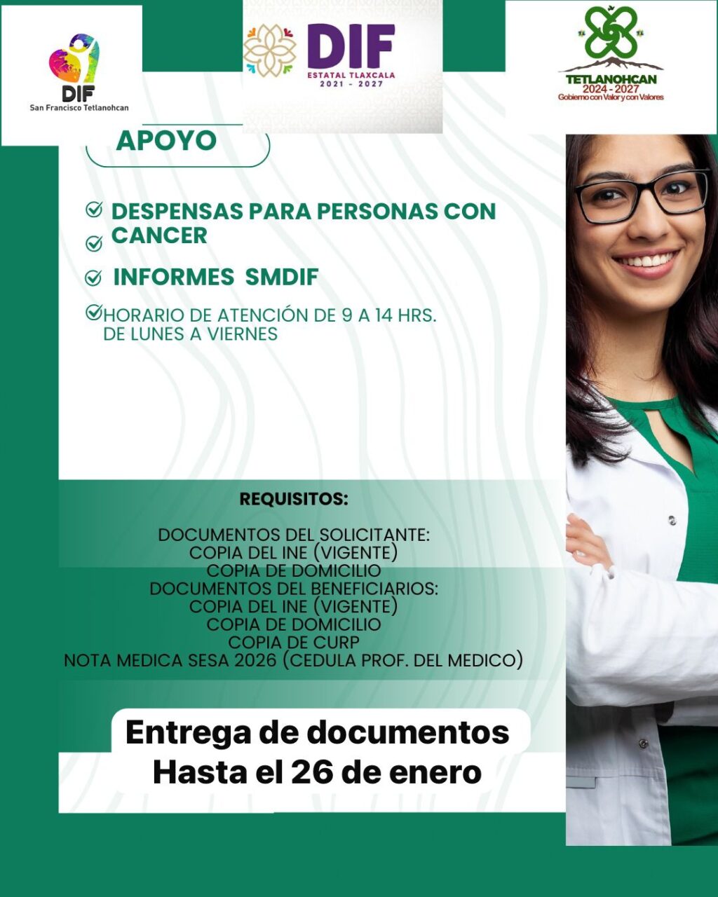 Informes y recepción de documentación: Oficinas del Sistema Municipal DIF de Tetlanohcan, horario de atención: lunes a viernes, de 9:00 a 14:00 horas.