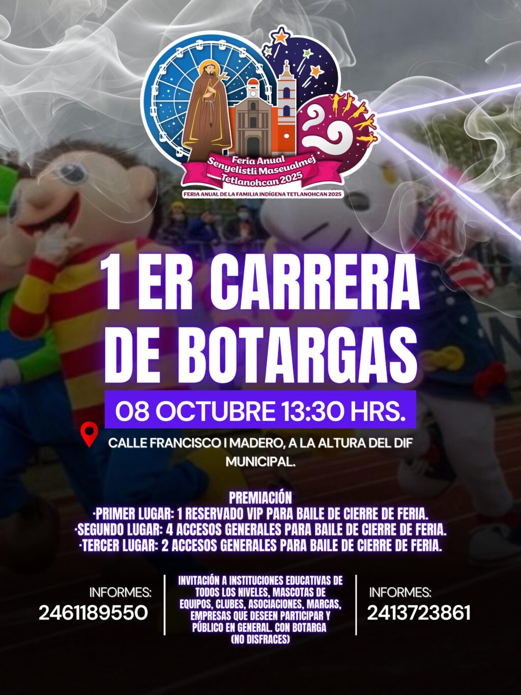 En el marco de la Feria Anual de la Familia Indígena Tetlanohcan 2025, el H. Ayuntamiento de San Francisco Tetlanohcan, encabezado por la presidenta municipal Kritsbey Pérez Flores, anunció la realización de la Primera Carrera de Botargas, un evento único que busca fomentar la sana convivencia y el entretenimiento entre familias, jóvenes y visitantes.