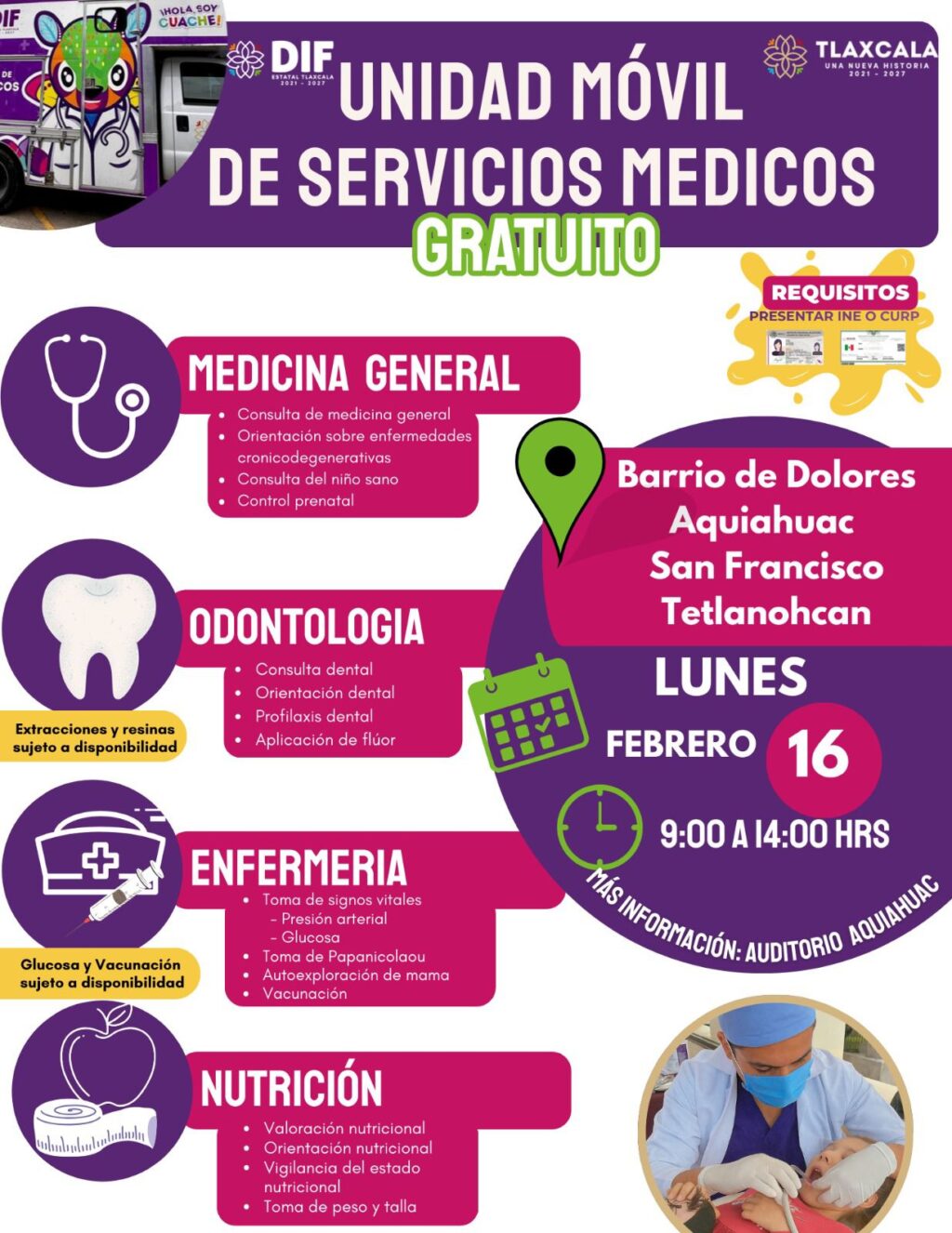 A través de la Unidad Móvil del DIF Estatal Tlaxcala, se brindarán servicios de medicina general, odontología, enfermería y nutrición, que incluirán consultas médicas, atención preventiva, toma de signos vitales, valoración nutricional y atención dental básica.