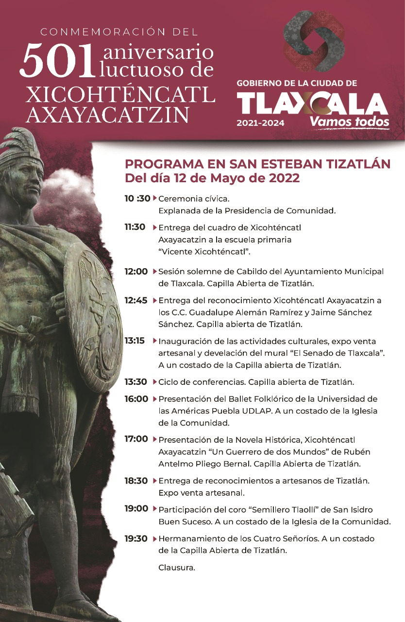 A partir de las 13:30 y hasta las 18:00 horas se desarrollarán actividades culturales, entre ellas un ciclo de conferencias sobre el guerrero tlaxcalteca, la participación del ballet folclórico de la Universidad de las Américas BUAP y la presentación de la novela histórica “Xicohténcatl Axayacatzin, un guerrero de dos mundos” a cargo del historiador Rubén Antelmo Pliego Bernal.