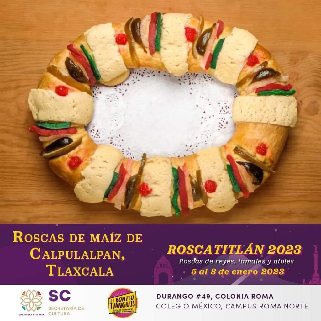 Con el apoyo de la Secretaría de Cultura local, Tlaxcala fue invitado especial del Roscatitlán 2023, organizado por “El Bonito Tianguis”, mercado alternativo, el cual se realiza del 5 al 8 de enero en la Ciudad de México, evento que reúne roscas tradicionales, rellenas, roscas de pulque, roscas veganas, entre otras, así como más de 110 expositores de gastronomía, belleza, regalos, textiles, accesorios y alimentos.
