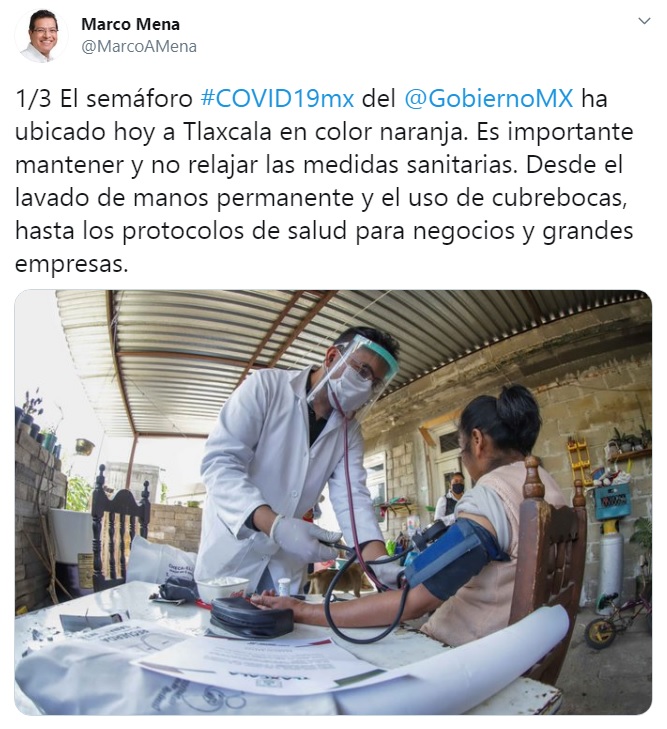 En sus cuentas de Twitter y Facebook, el Gobernador Mena publicó: “1/3 El semáforo #COVID19mx del @GobiernoMX ha ubicado hoy a Tlaxcala en color naranja. Es importante mantener y no relajar las medidas sanitarias. Desde el lavado de manos permanente y el uso de cubrebocas, hasta los protocolos de salud para negocios y grandes empresas.