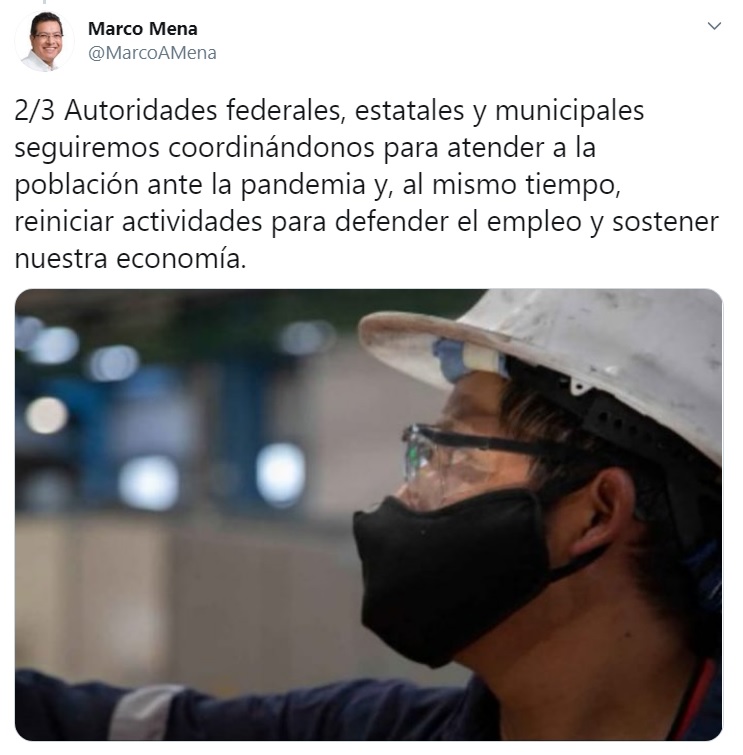 En un segundo mensaje, informó: “2/3 Autoridades federales, estatales y municipales seguiremos coordinándonos para atender a la población ante la pandemia y, al mismo tiempo, reiniciar actividades para defender el empleo y sostener nuestra economía”.