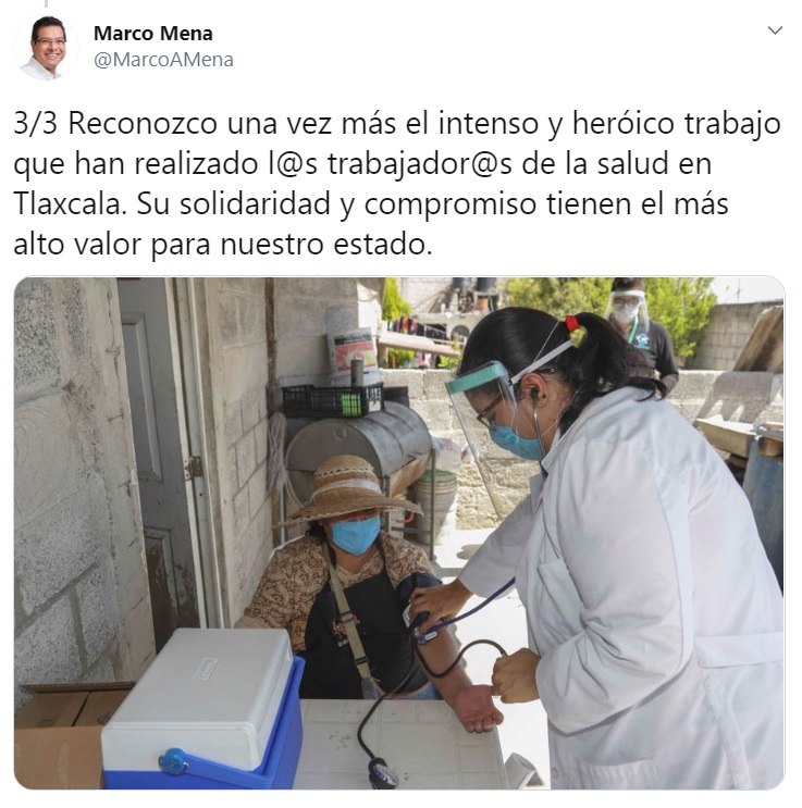 Finalmente, escribió: “3/3 Reconozco una vez más el intenso y heróico trabajo que han realizado l@s trabajador@s de la salud en Tlaxcala. Su solidaridad y compromiso tienen el más alto valor para nuestro estado”.