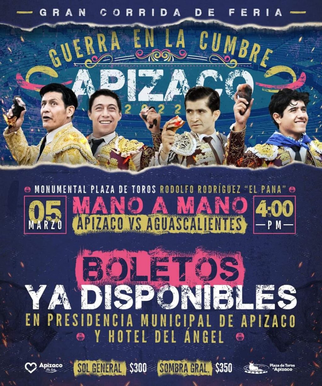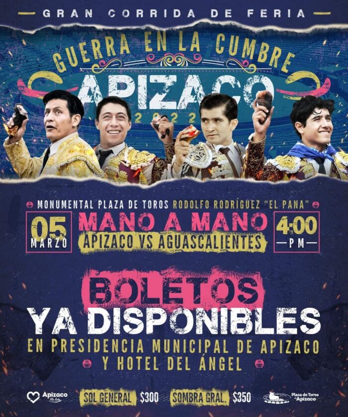 El Presidente Municipal de Apizaco, Pablo Badillo Sánchez, acompañado de los matadores, Uriel Moreno El Zapata, Joselito Adame y Luis David Adame hicieron la presentación oficial del espectacular cartel de corrida de toros “Guerra en la Cumbre 2022” a llevarse a cabo el próximo 5 de marzo.