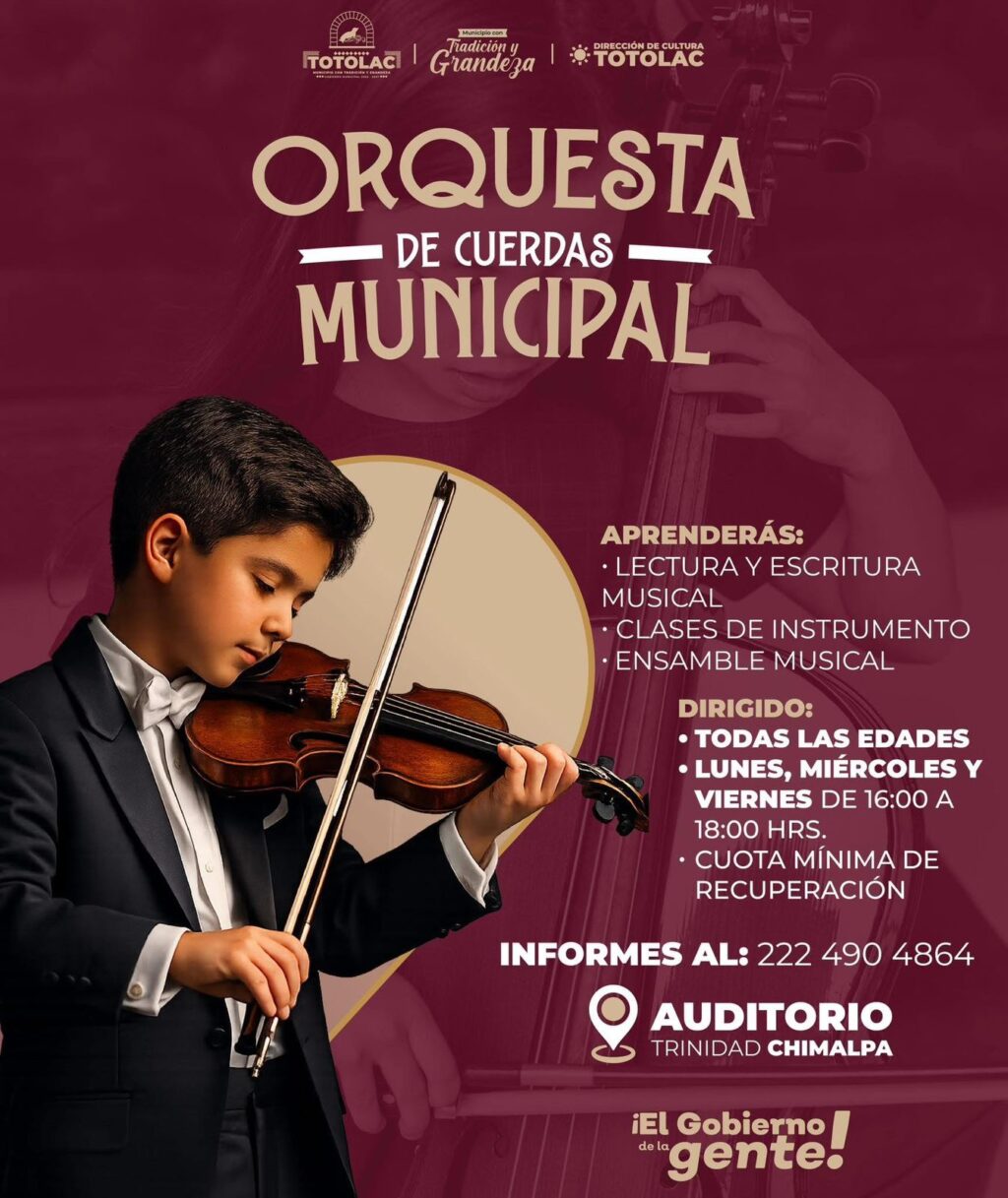El Gobierno Municipal de Totolac 2024-2027 continúa fortaleciendo espacios dedicados al arte, la cultura y el desarrollo de la población, mediante el impulso de la Orquesta de Cuerdas Municipal, un proyecto formativo abierto para niñas, niños, jóvenes y adultos.