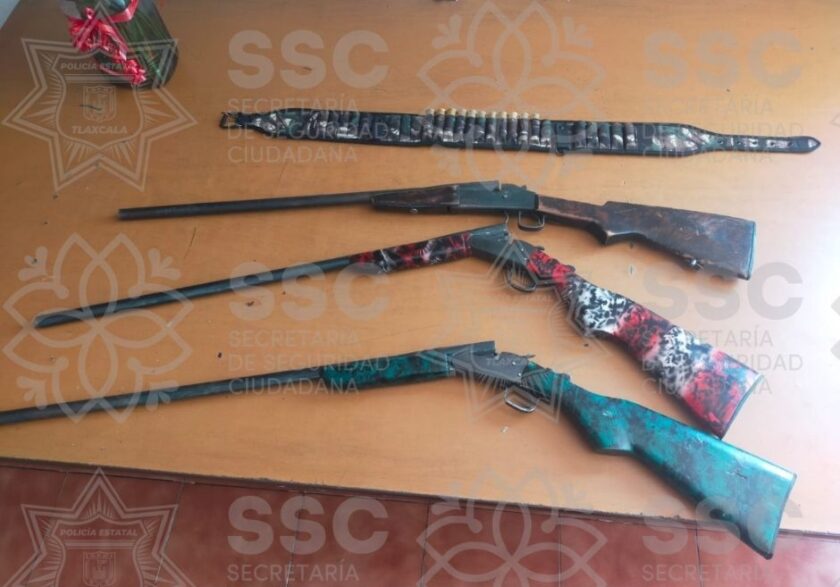 Es así como los efectivos de la SSC localizaron en la parte trasera tres armas largas tipo escopetas Stevens, al parecer de fabricación artesanal, dos de ellas de calibre 16mm con cuatro cartuchos útiles y una más de calibre 20mm con 7 cartuchos útiles.