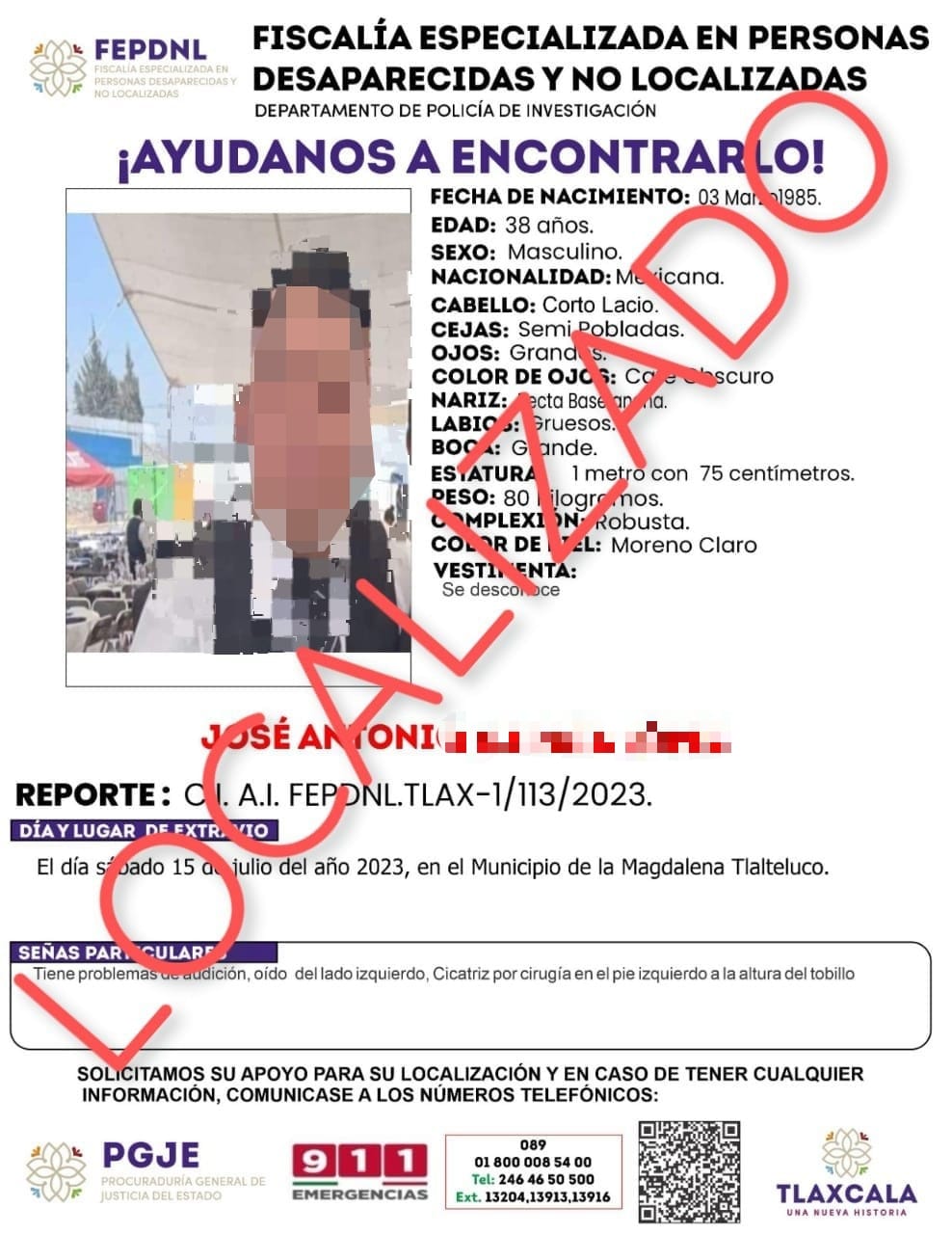 Agentes de la Policía de Investigación de la Fiscalía Especializada en Personas Desaparecidas y No Localizadas (Fepdnl) adscrita a la Procuraduría General de Justicia del Estado (PGJE) localizaron a una persona del sexo masculino, reportado como desaparecido por sus familiares al no tener noticias de su paradero.