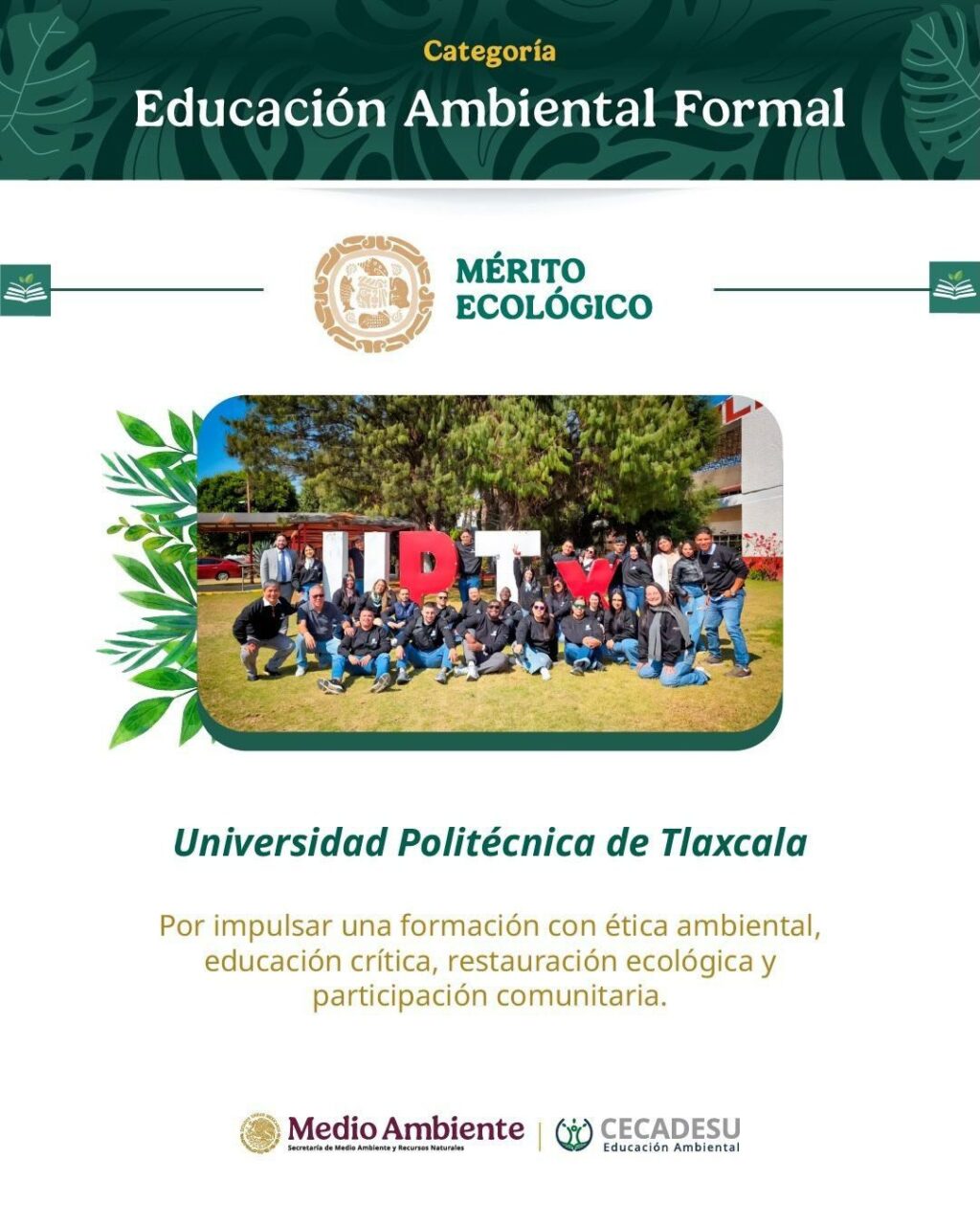 La Universidad Politécnica de Tlaxcala (UPTLAX) fue galardonada con el Premio al Mérito Ecológico 2026 en la categoría de Educación Ambiental Formal, uno de los reconocimientos más importantes del país en materia ambiental, otorgado por el Gobierno de México a través de la Secretaría de Medio Ambiente y Recursos Naturales.