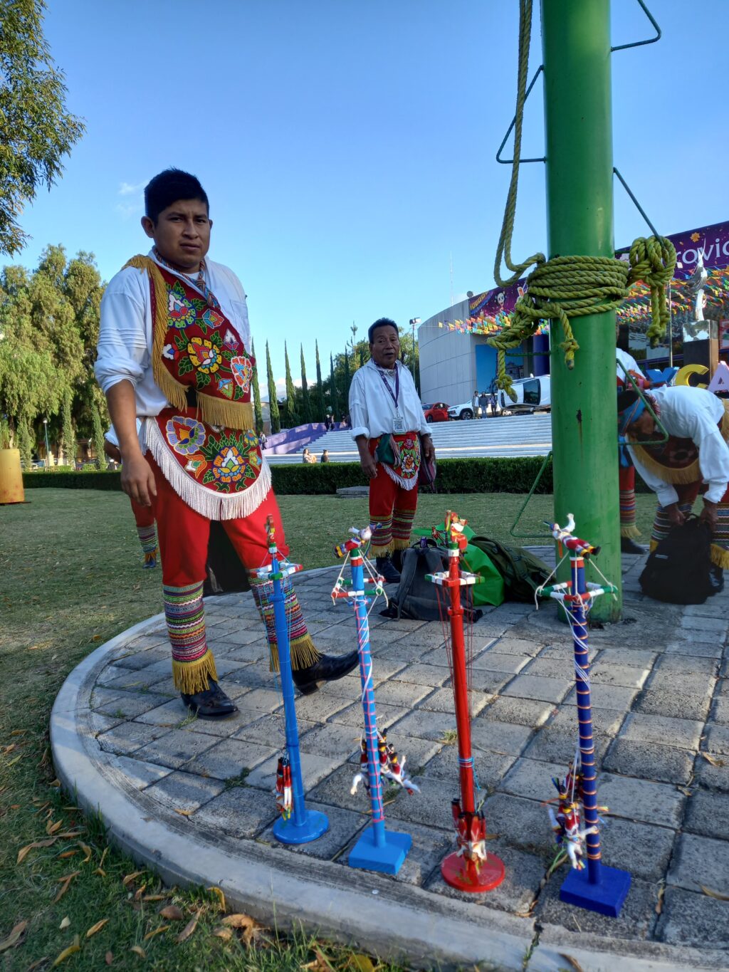 Los sonidos del tamborcillo y el flautín resuenan en las alturas, mientras cuatro personas se lanzan al vacío desde un mástil, sujetos únicamente por cuerdas y poco a poco van descendiendo en círculos, hasta tocar el suelo.