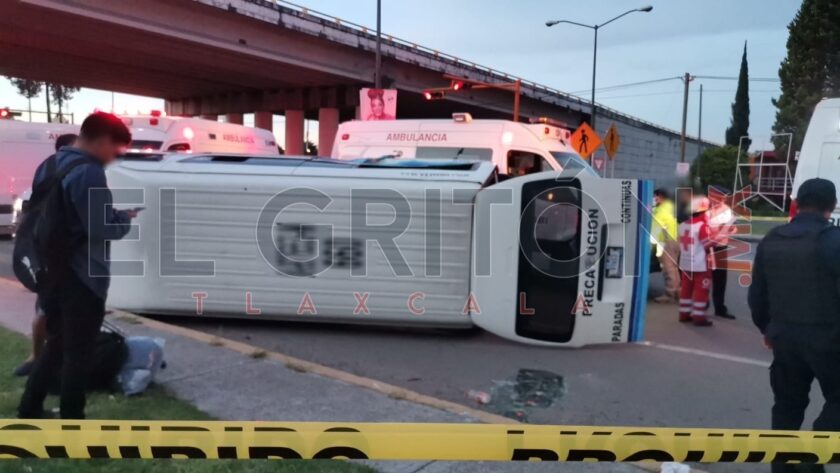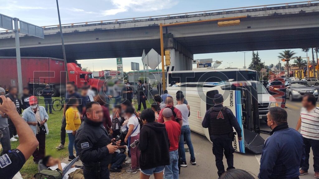 Al menos siete personas lesionadas y daños materiales aún sin cuantificar fue el saldo que dejó una volcadura de una unidad de transporte público, en la carretera Tlaxcala-Puebla en la comunidad de Acuitlapilco, municipio de Tlaxcala, a la altura del puente Periférico.